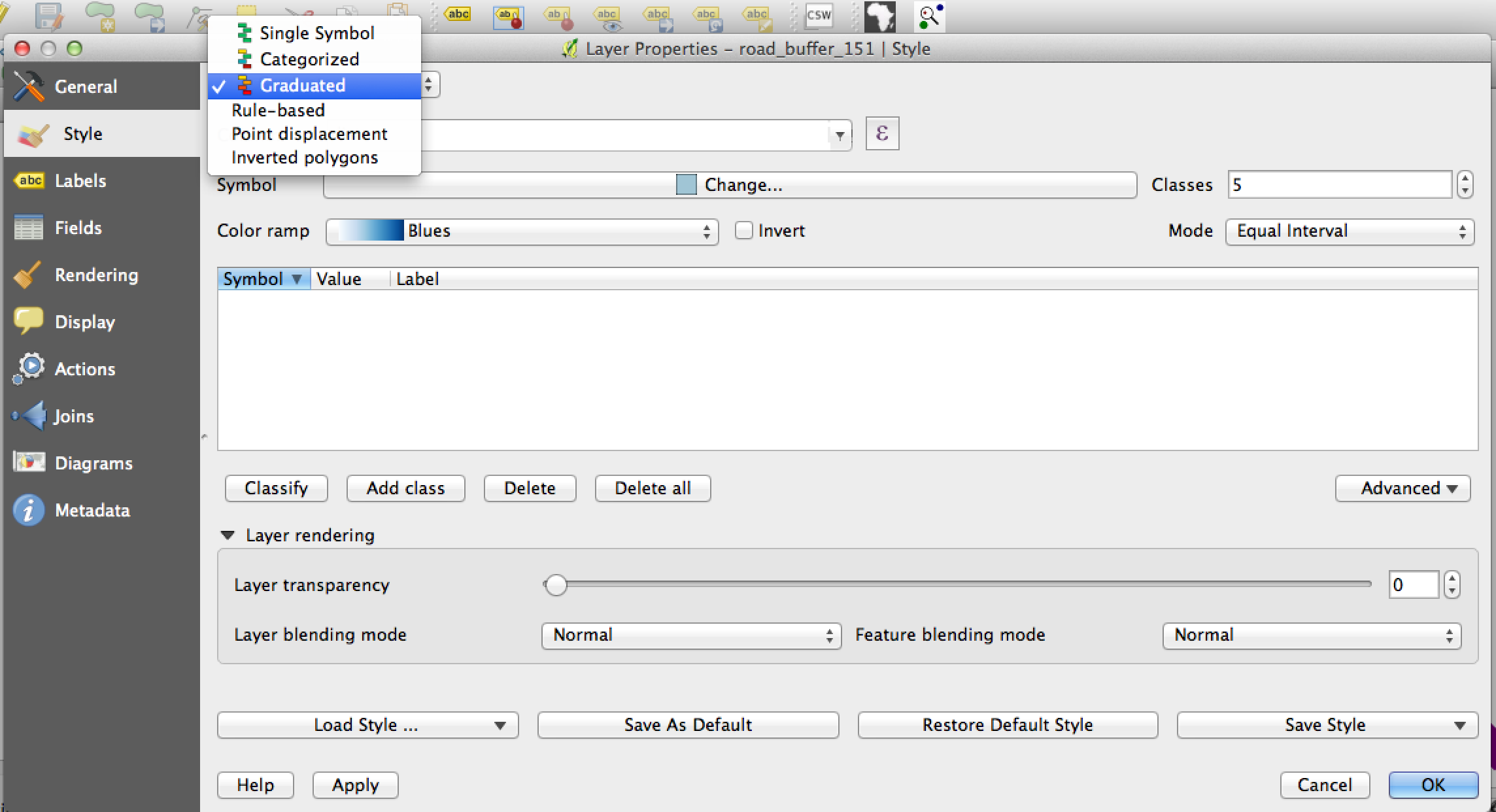 Next we will apply some thematic styling to our layer. We will add a graduated red to yellow color from the center of the road. The 5 meter reservation will be red and the 25 meter will be yellow.